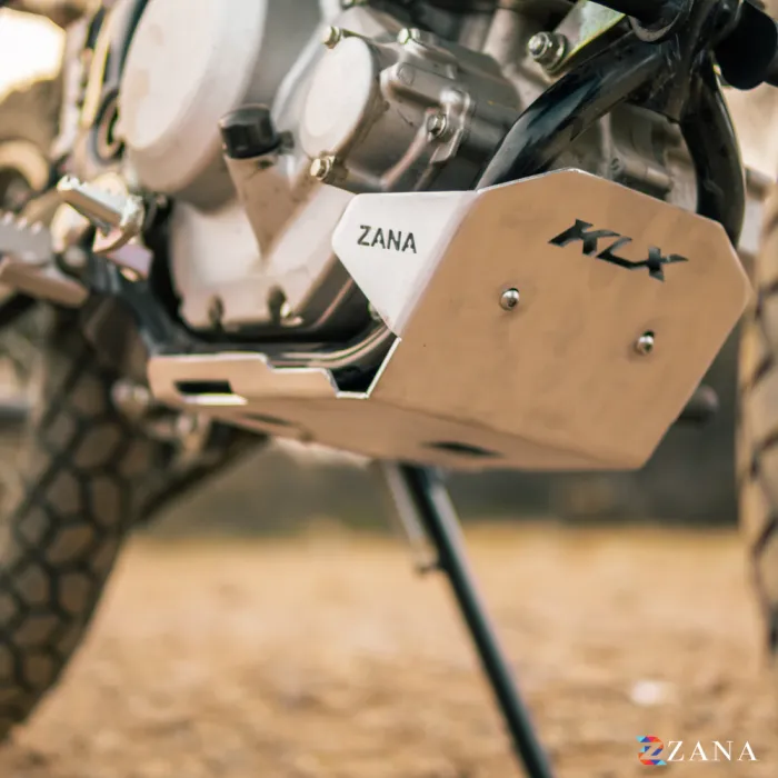 Bash Plate Silver Aluminum for Kawasaki KLX 230 : Lightweight, strong aluminum construction, mounted on durable Zana brackets. Floating design prevents engine damage. Includes hardware and manual.