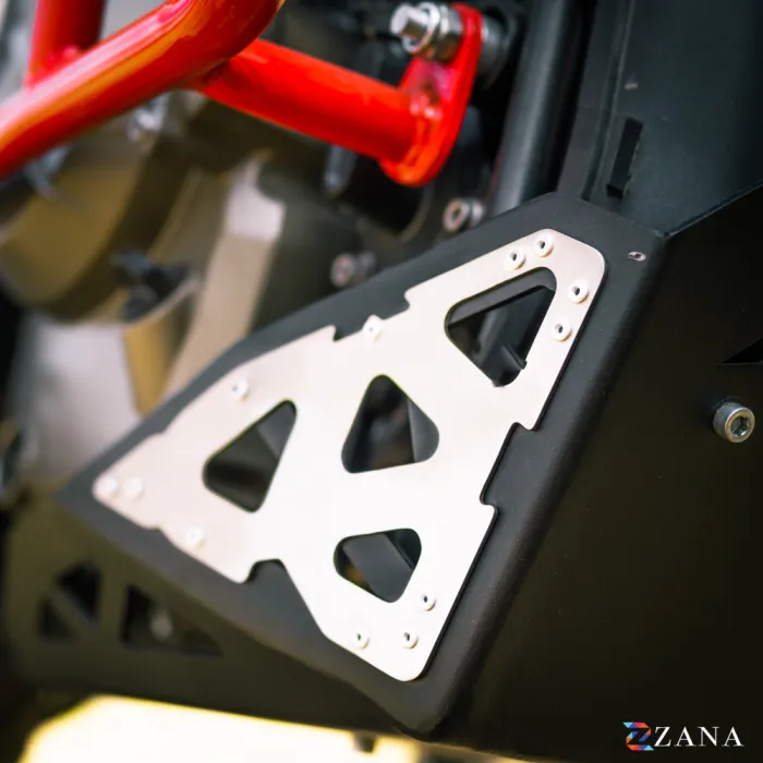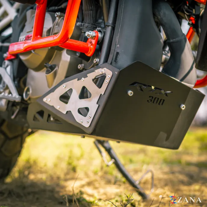 Bash Plate Black Aluminium for TVS Apache RTX 300 is designed to protect the oil filter from debris and impacts. It features a floating mounting mechanism, strong Zana brackets, and vented design for improved air and water flow.