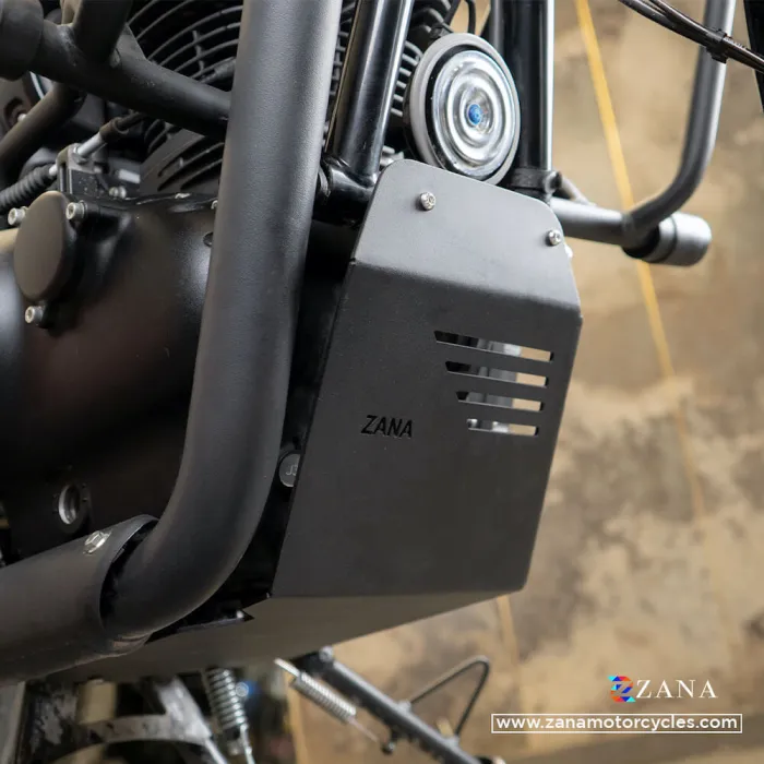 Bash Plate for Royal Enfield Hunter 350 is made from 3mm aluminum, offering protection against debris and impacts. It features floating mounting, side vents for cooling, and comes with mounting hardware