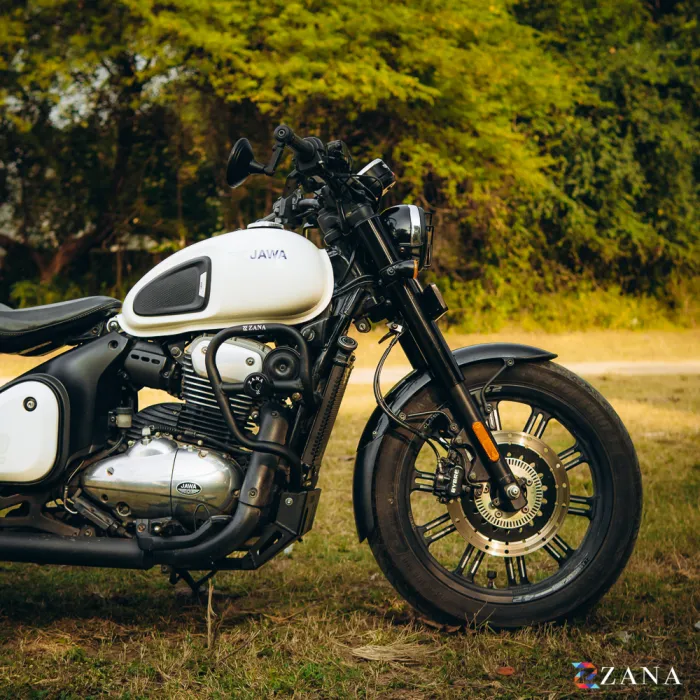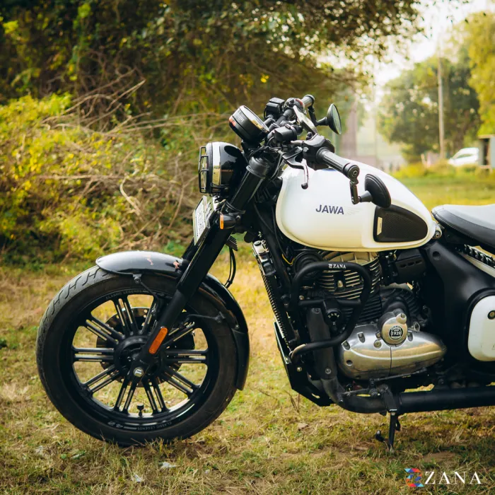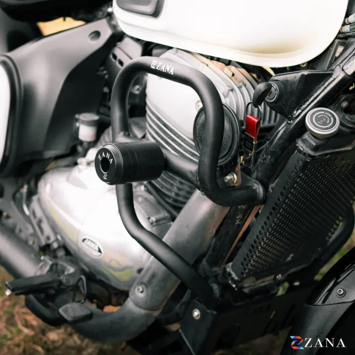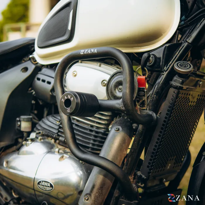 Zana Crash Guard T-2 for Jawa Bobber 42 offers durable mild steel protection with a 2-point locking system and sliders. Provides engine safety, rust-free reliability, and 6-Month Paint/Coating Warranty.