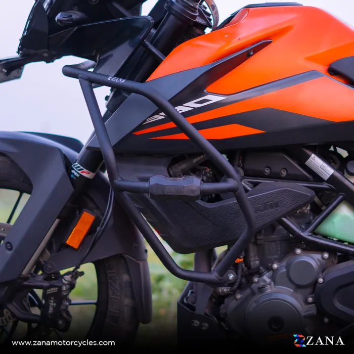 Crash Guard for KTM 250/390/390 X ADV with Slider - Patent design by ZANA. Heavy-duty steel tubes, 3-point mounting, radiator, engine, and tank protection. Easy DIY install. 6-month warranty