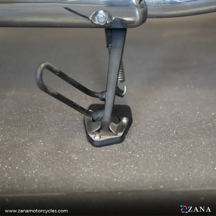 Side Stand Extender for Royal Enfield Super Meteor 650 offers stability with a non-slip design, made of aluminum & stainless steel. Easy installation, lifetime warranty, and prevents sinking.
