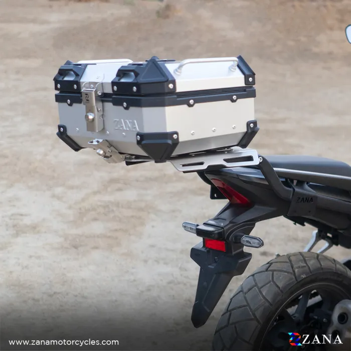 Compatible with the Zana Top Rack, specially crafted for aluminum boxes, the top box offers a secure locking mechanism on any motorcycle. The plastic heavy-duty armor corners provide extra protection against bumps and impacts, while the heavy-duty mounting plate is included for universal top racks.