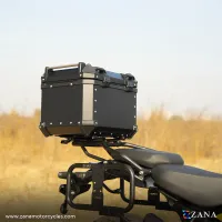 Key features include a 7kg load capacity (as per motorcycle chassis) and a waterproof inner liner that is easy to clean with mild detergent, ensuring a dry and protected storage space. The box also features heavy-duty plastic armour corners that absorb impacts and protect against bumps, making it ideal for off-road trips. The stainless steel lock with copy-proof keys provides added security, while the universal heavy-duty mounting plate ensures compatibility with any motorcycle when paired with the Zana top rack designed for aluminium boxes.