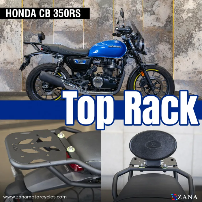 Top Rack with Plate for Honda CB350 RS Exclusive Zana patent design with a 10 kg max load and 35L top box capacity. Compatible with stock RS seat and Zana pillion backrest. Pillion backrest not included . 6-month paint warranty (no accidents)