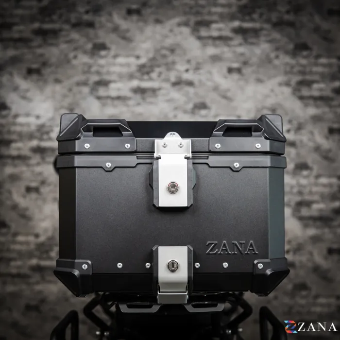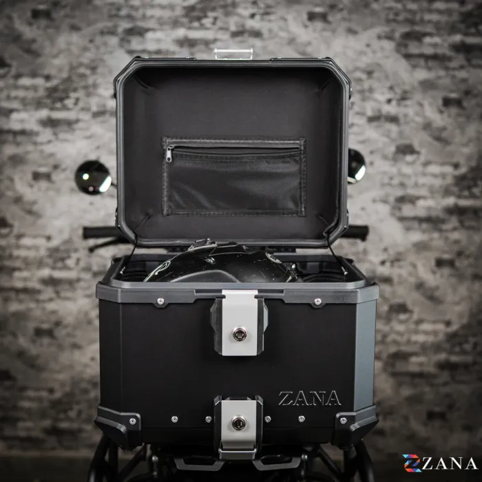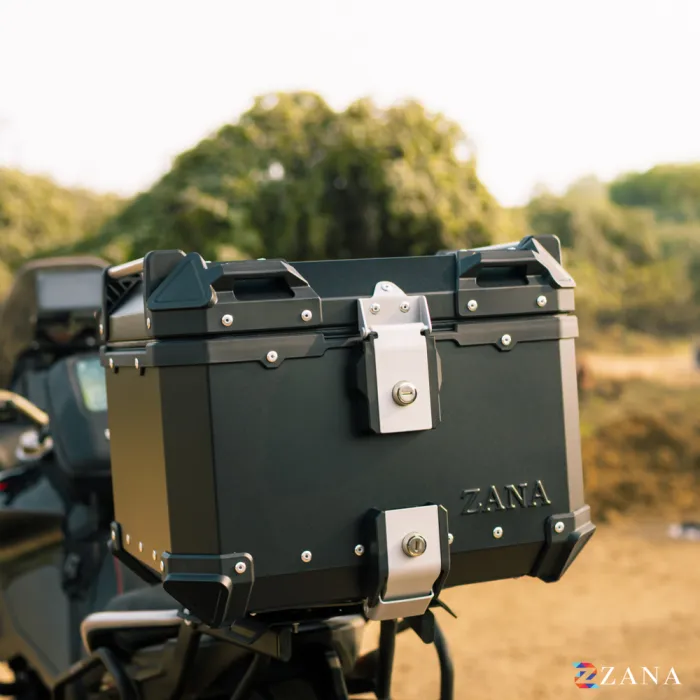 This top box securely locks onto any motorcycle with the specially crafted ZANA top rack, which is designed for use with aluminium boxes. Heavy-duty armour corners protect the box from bumps, ensuring your gear stays safe. The heavy-duty mounting plate is compatible with universal top racks, and all parts are available as spares if needed.