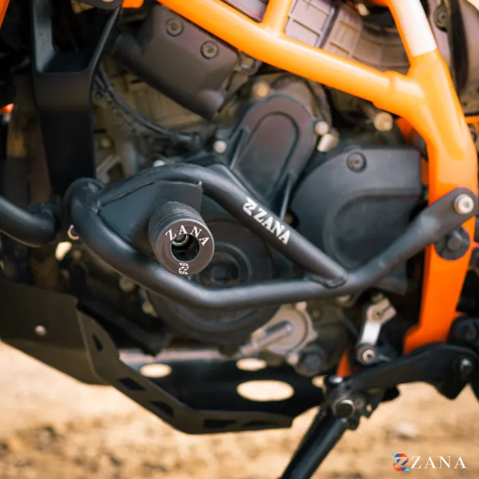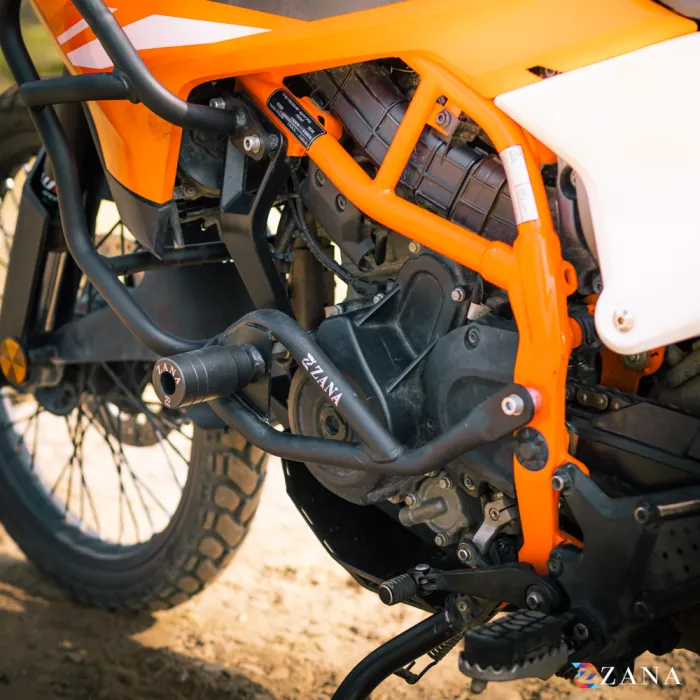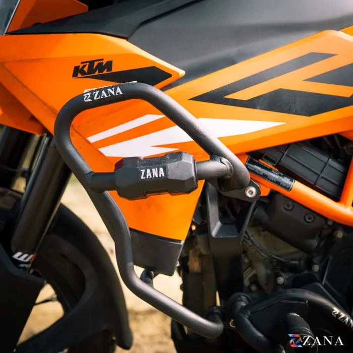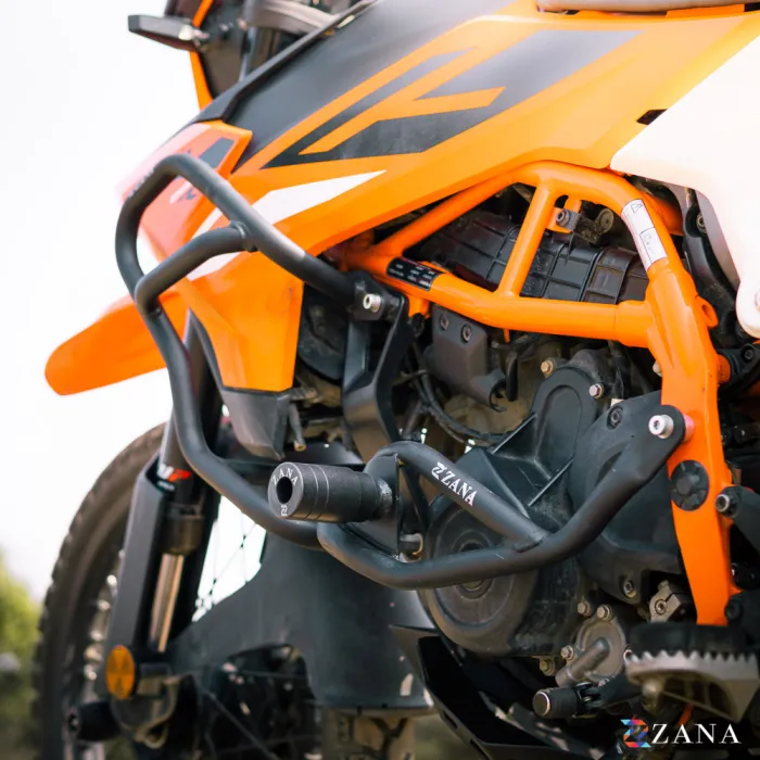 KTM ADV 390 2025 Black Upper & Lower Crash Guard Set with Round slider by Zana – a rugged touring-and-trail-ready crash guard setup designed to protect your engine, fairing, and vital components on highways and off-road terrain.Compatible with Puck Sliders also (sold separately).
