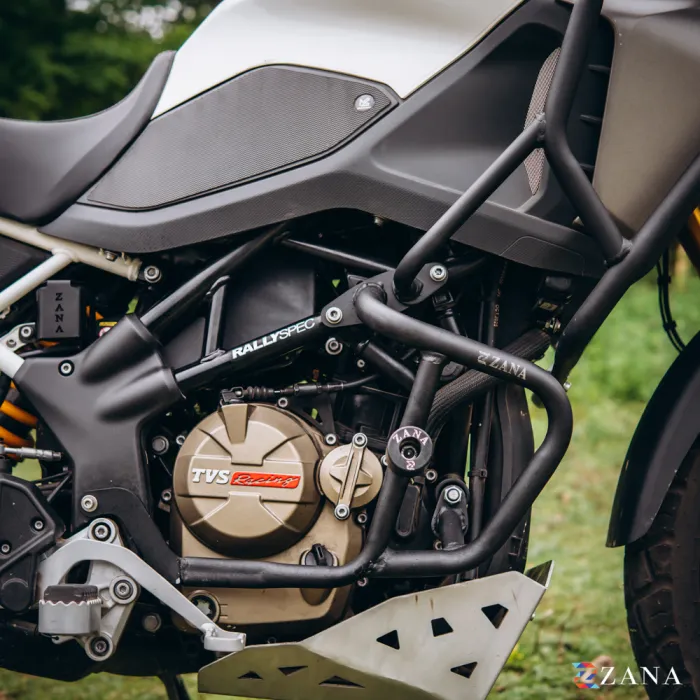 Heavy-duty Upper & Lower Crash Guard Combo designed specifically for the TVS Apache RTX 300 BEAK Version, offering reliable protection for the engine, gearbox, tank, and fairing during falls or impacts. Ideal for adventure riding, touring, and daily use.