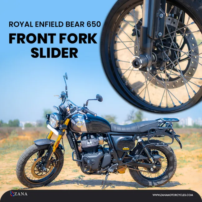 Front Fork Sliders for Royal Enfield Bear 650 are essential protective accessories designed to safeguard your motorcycle’s front suspension during unforeseen impacts or falls. These high-performance fork sliders are crafted to absorb shock and minimize damage to critical components like the fork legs, brake calipers, and wheel hubs. Whether you’re navigating city roads or taking on rugged trails, front fork sliders add an extra layer of protection to keep your Royal Enfield Bear 650 in top condition. Made from premium-grade materials, these sliders are built for durability and long-lasting performance. The sleek and lightweight design ensures they don’t compromise the handling or appearance of your bike. The fork sliders are easy to install, offering a hassle-free upgrade for riders seeking enhanced safety and peace of mind on the road. In addition to providing protection, front fork sliders also enhance the bike’s aesthetic appeal by adding a sporty, rugged touch. For riders who prioritize both performance and style, these sliders are a must-have accessory. Tags: Front Fork Sliders for Royal Enfield Bear 650, Royal Enfield Bear 650 accessories, motorcycle fork protection, durable fork sliders, front fork crash protectors, Royal Enfield safety parts, front suspension protection for Bear 650.