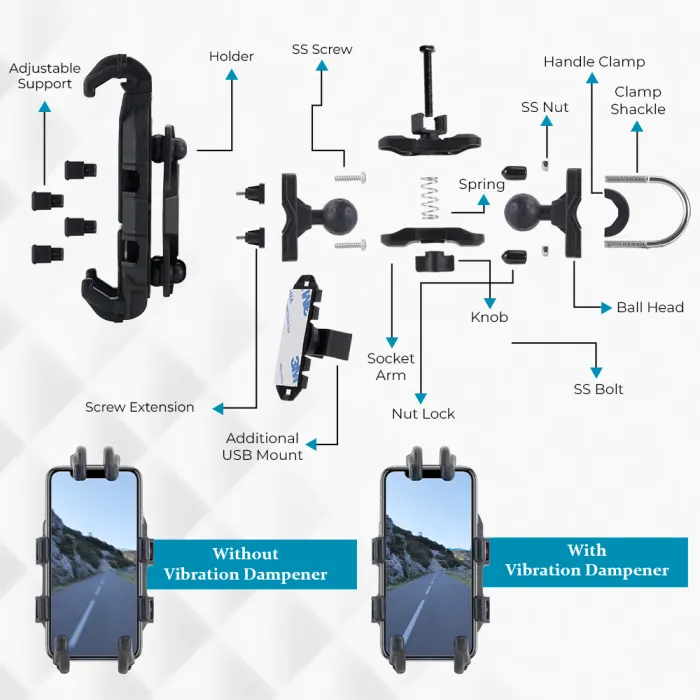 The Universal Mobile Holder with USB Charger is designed to securely hold your phone on your motorcycle while providing convenient charging. This mount ensures a safe and stable fit, allowing you to access your phone easily while on the go. The adjustable side supports are customizable to fit different phone sizes. With a durable construction, it ensures long-lasting performance even under challenging conditions.