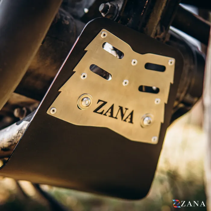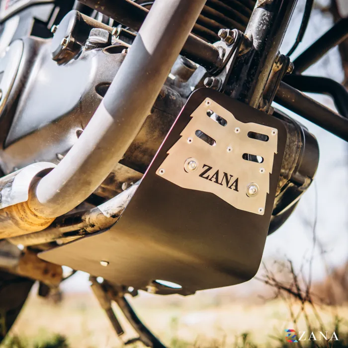A distinctive ZANA logo design on a silver plated panel adds a premium visual element while reinforcing the rugged look of the motorcycle. The design ensures no loss of ground clearance, allowing smooth handling across different terrains. Equipped with strong Zana brackets and secure mounts, it delivers excellent stability without affecting bike performance. The vented design also improves airflow and water drainage to help maintain optimal engine conditions.