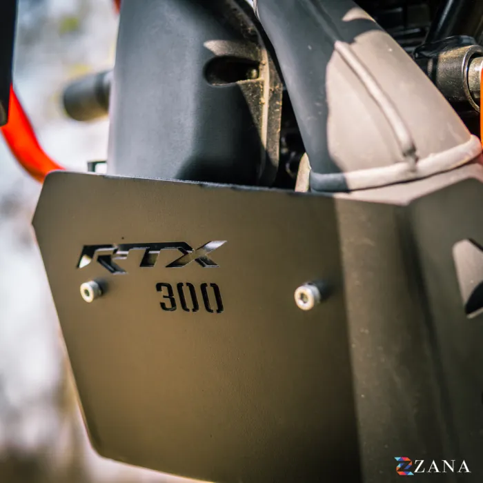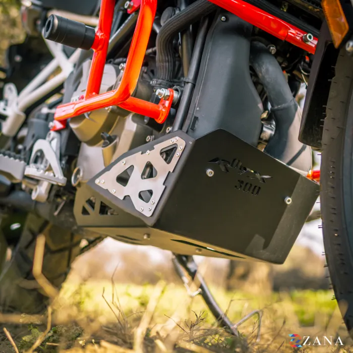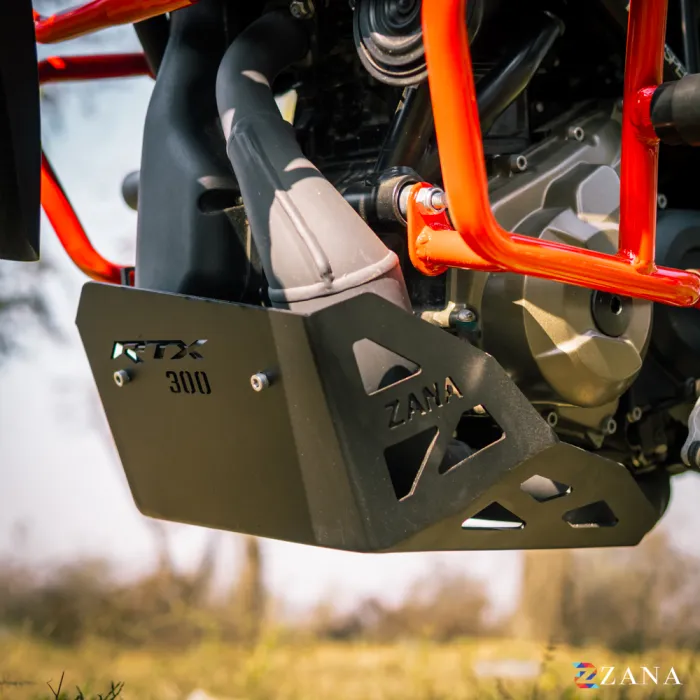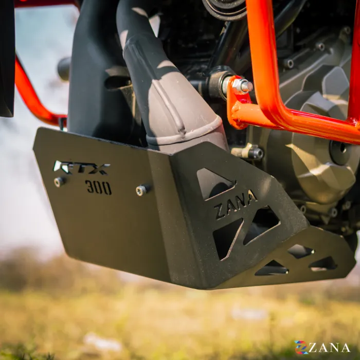 Bash Plate Black Aluminium for TVS Apache RTX 300 is designed to protect the oil filter from debris and impacts. It features a floating mounting mechanism, strong Zana brackets, and vented design for improved air and water flow.