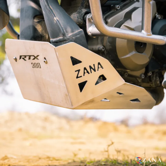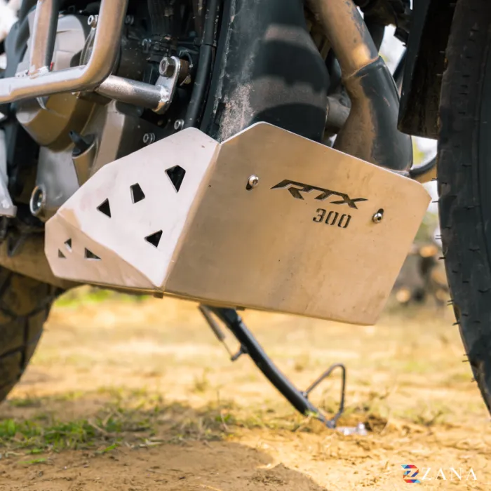 Bash Plate Silver Aluminium for TVS Apache RTX 300 is designed to protect the oil filter from debris and impacts. It features a floating mounting mechanism, strong Zana brackets, and vented design for improved air and water flow.