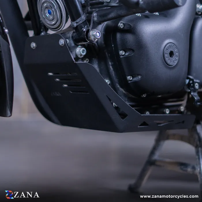 Bash Plate for Royal Enfield Hunter 350 is made from 3mm aluminum, offering protection against debris and impacts. It features floating mounting, side vents for cooling, and comes with mounting hardware