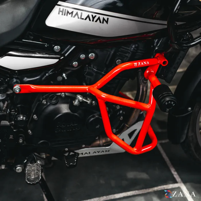 Zana Crash Guard T-1 V-2 (Red) for Himalayan 450 offers durable mild steel protection with a 4-point locking system and sliders. Provides engine safety, rust-free reliability, and a lifelong warranty against defects.