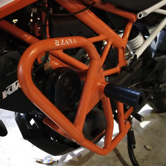 Crash Guard for KTM 250/390Patent design by Zana Motorcycles, offering protection for the radiator, engine casing, and fuel tank. Includes precision welding, stainless steel hardware, polymer spacers, and sliders