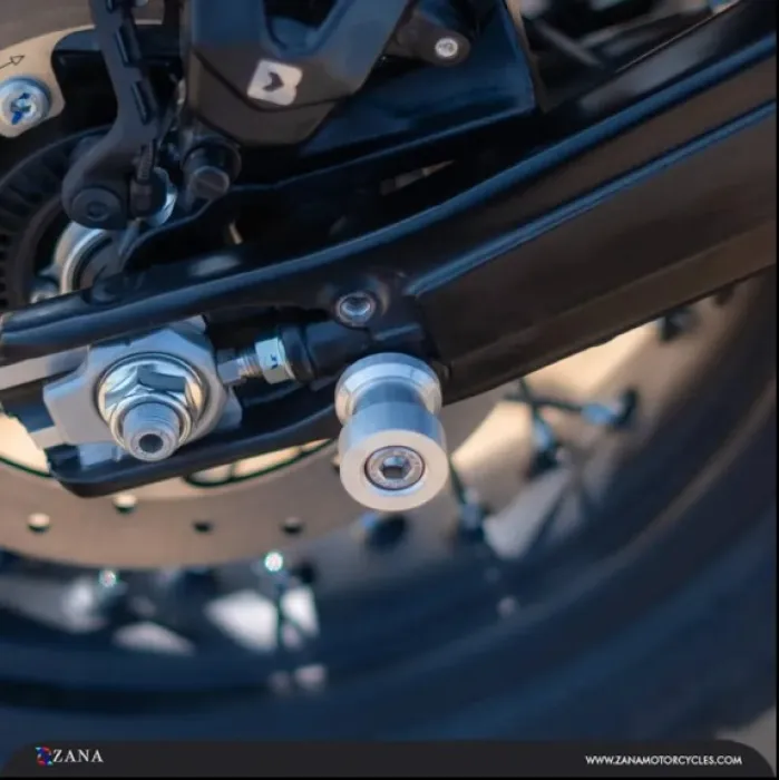 The Zana Rear Paddock Spools for KTM Adventure 390/390 X offer excellent protection for the swing arm, chain, and rear sprocket. These spools are compatible with Zana and non-Zana paddock stands and feature a unique design to prevent accidental slippage. The 100% rust-free, easy-to-install spools ensure long-lasting durability, while the silver finish enhances your bike's appearance.