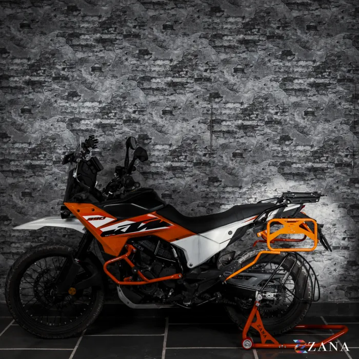 Premium Saddle Stay with Jerry Can Mount for KTM ADV 390 2025, designed for extra fuel storage and luggage support. Built for adventure, durability, and stability.