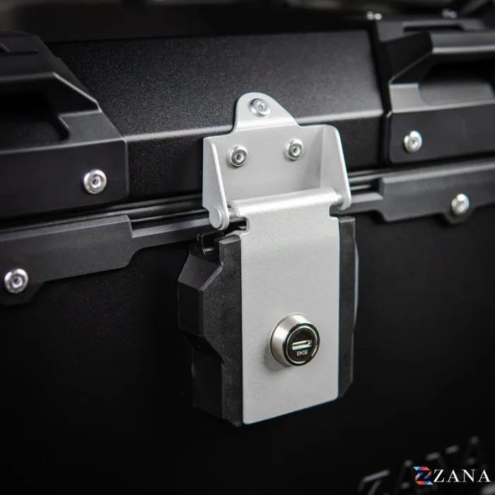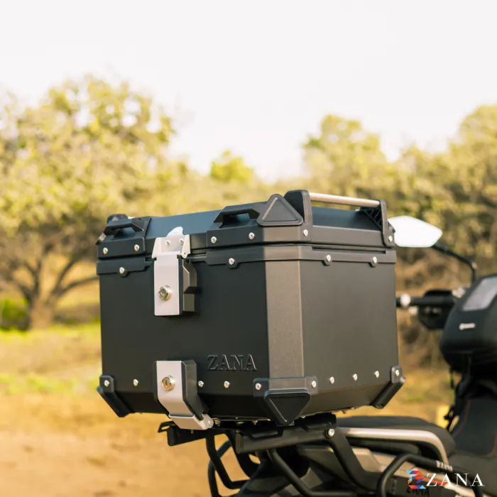 This top box securely locks onto any motorcycle with the specially crafted ZANA top rack, which is designed for use with aluminium boxes. Heavy-duty armour corners protect the box from bumps, ensuring your gear stays safe. The heavy-duty mounting plate is compatible with universal top racks, and all parts are available as spares if needed.