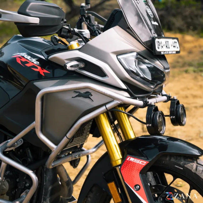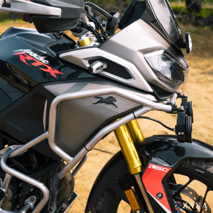 Upgrade your TVS Apache RTX 300 with Zana’s Upper & Lower Crash Guard with Slider Combo (Silver) and ride with confidence—on highways, trails, and everything in between.