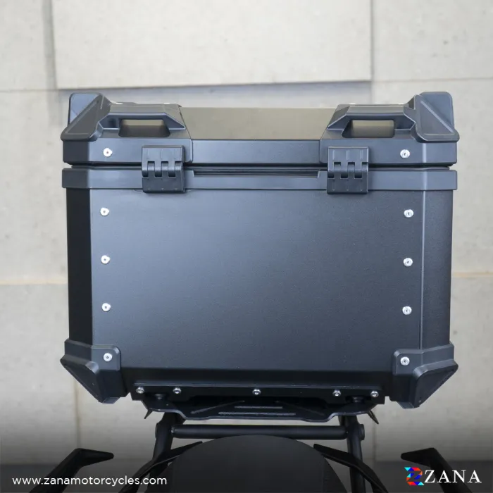 The top box comes with a universal mounting plate, ensuring easy installation onto the ZANA Top Rack system, which is compatible with the BMW R 1300 GS.